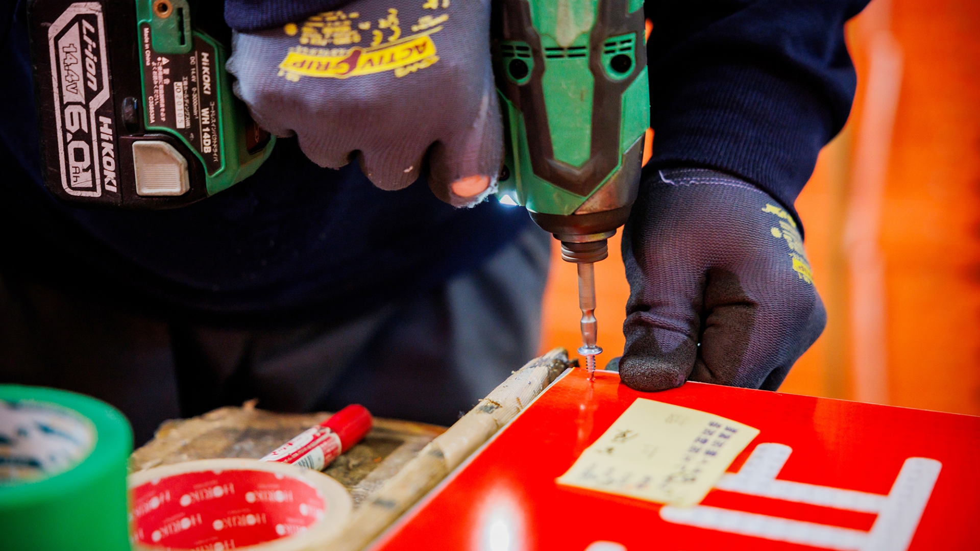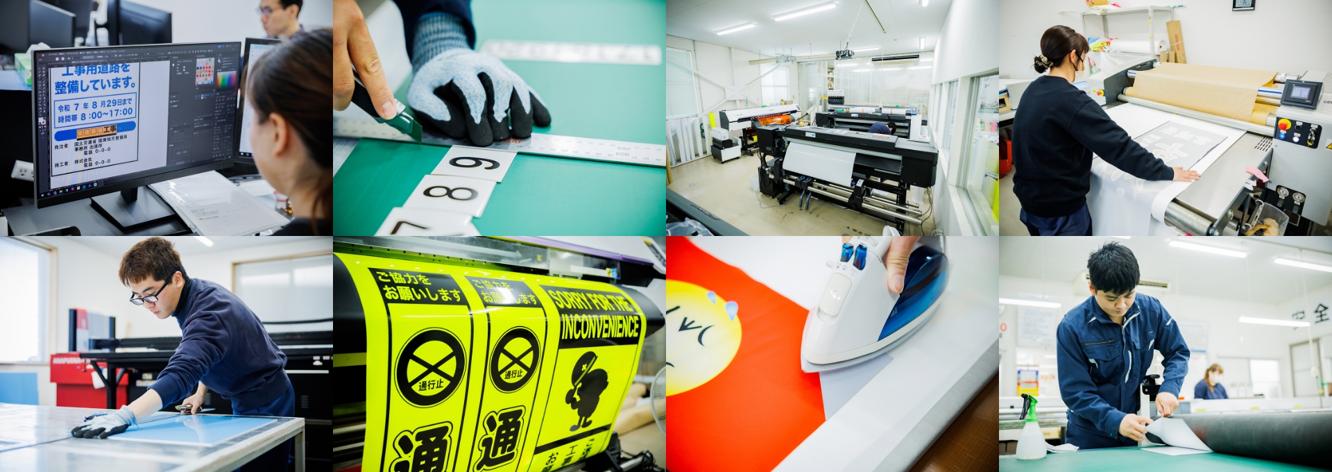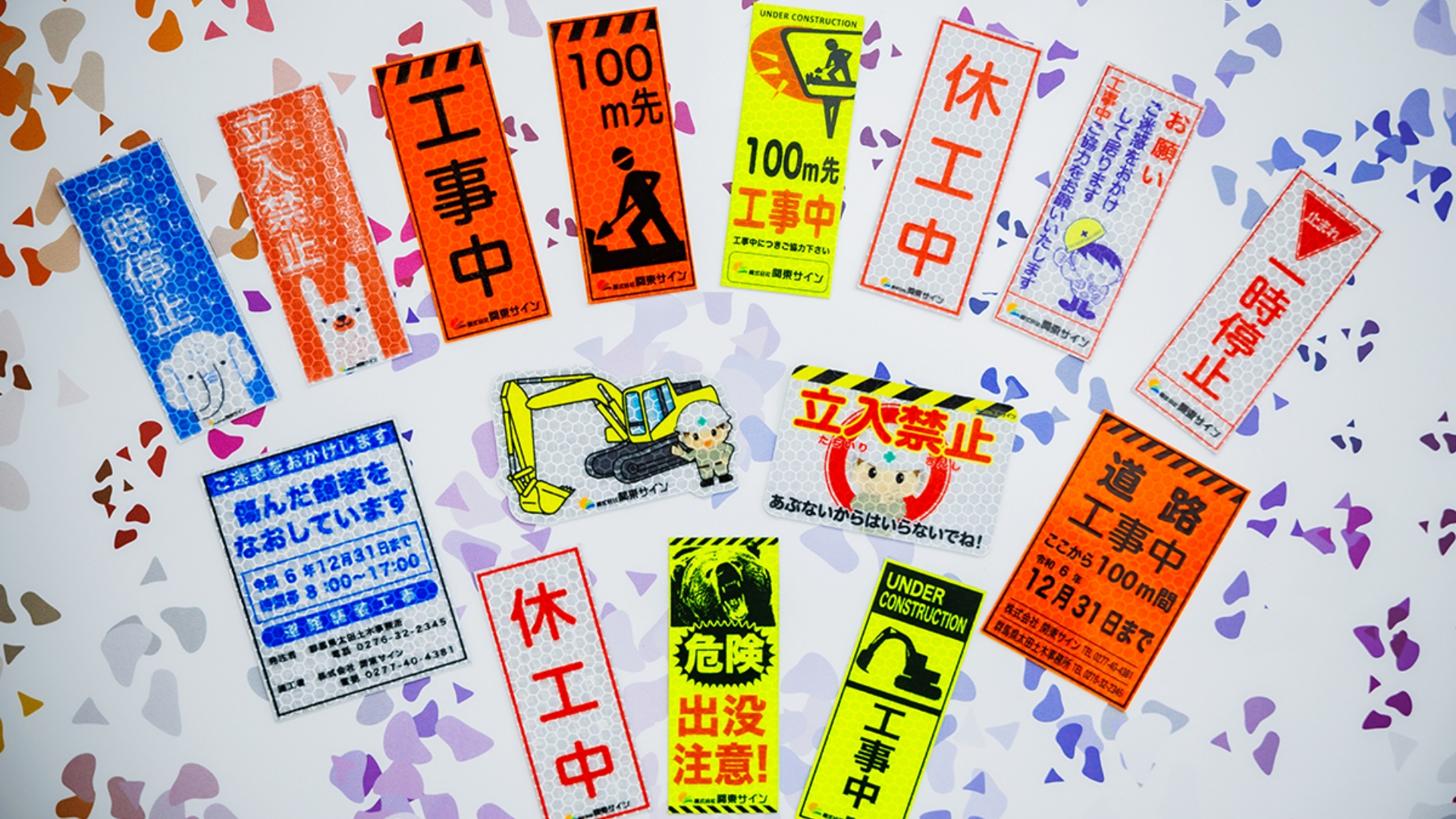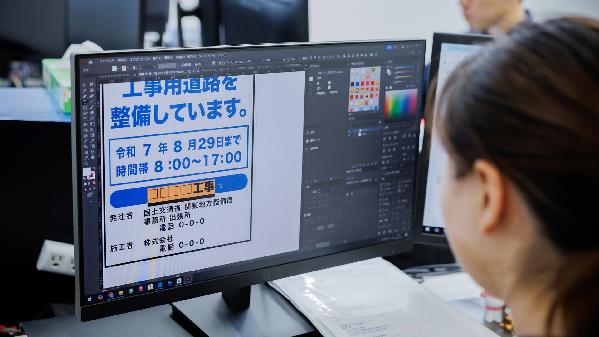 道路工事の際に見かける、「傷んだ舗装をなおしています」「片側交互通行ご協力ください」などの立看板をつくっているのが当社です。